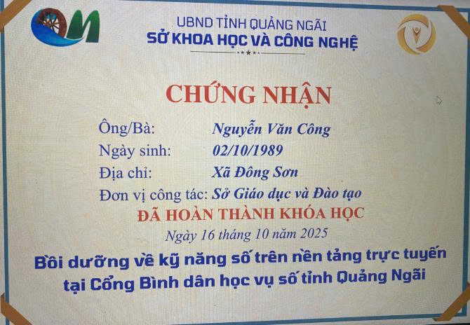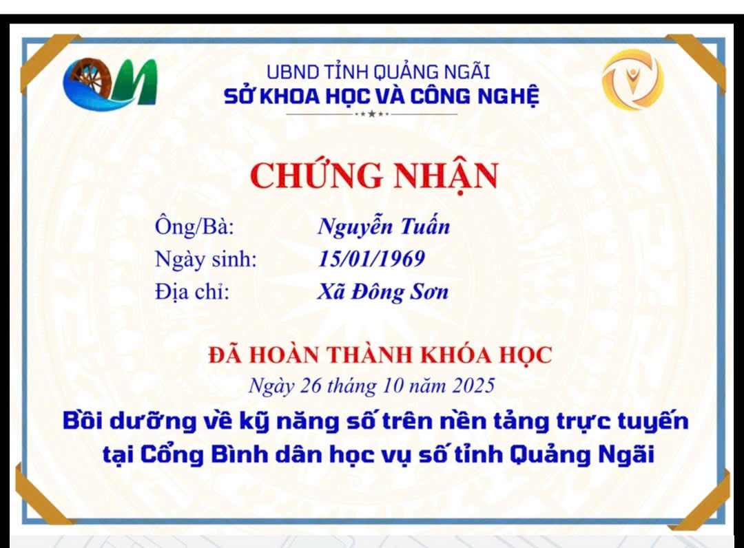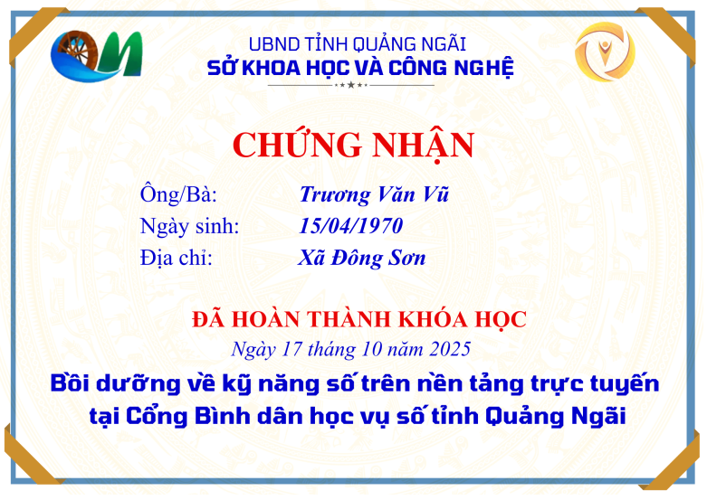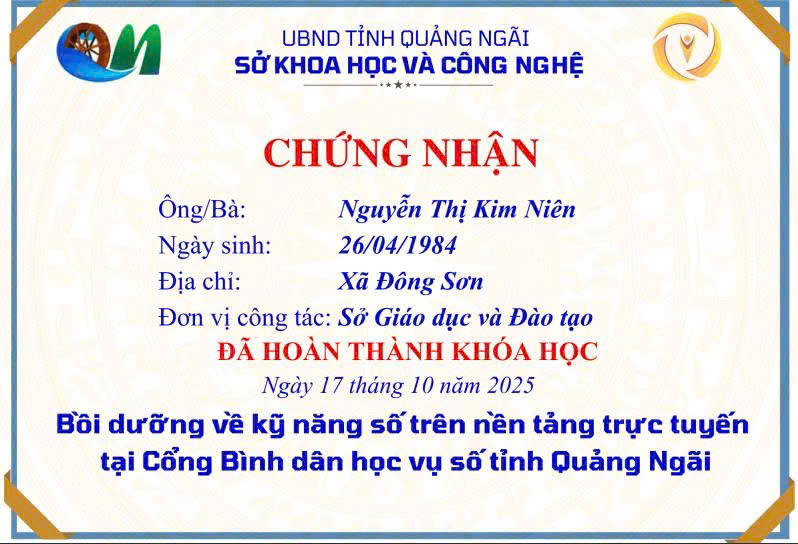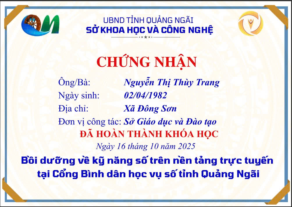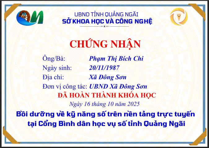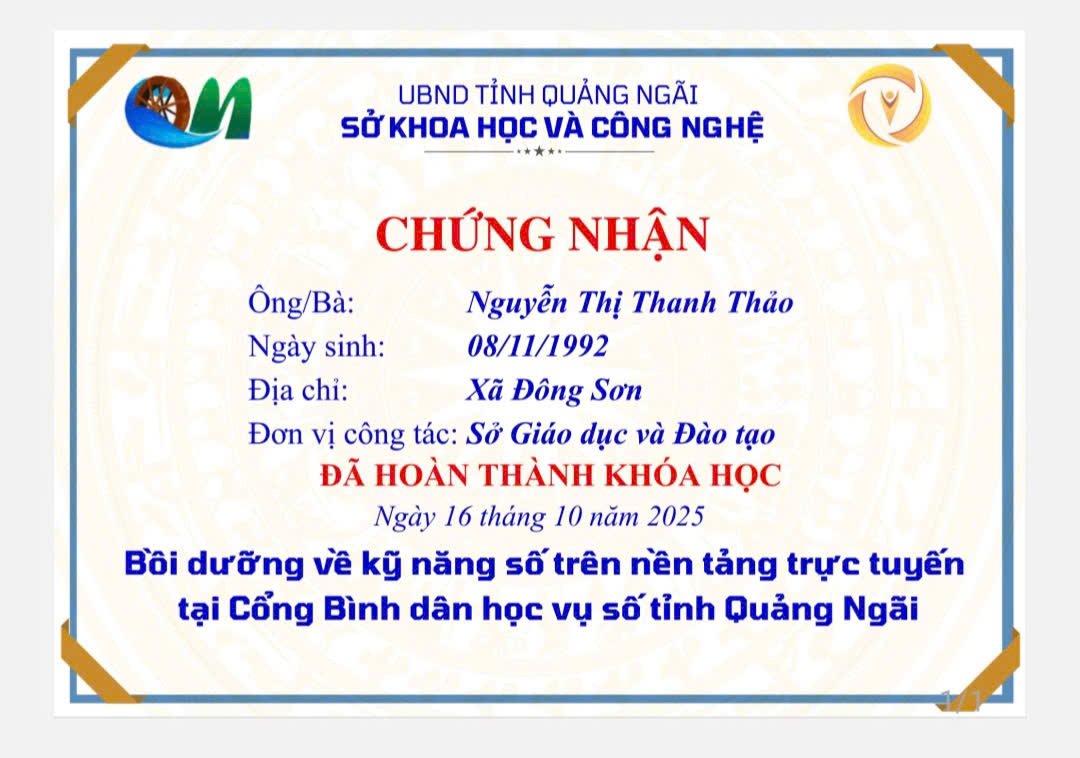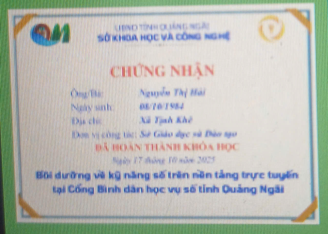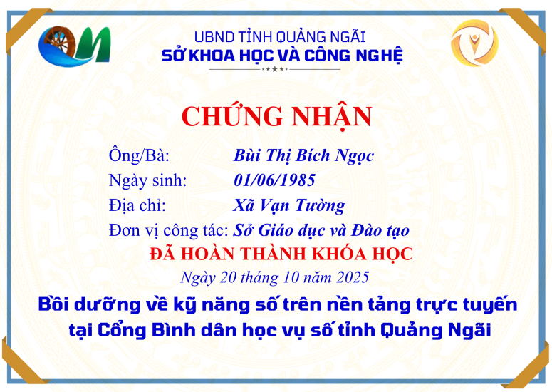 Chứng nhận bồi dưỡng kỹ năng số trên nền tảng “Bình dân học vụ số” tỉnh Quảng Ngãi của trường Tiểu học số 2 Bình Châu