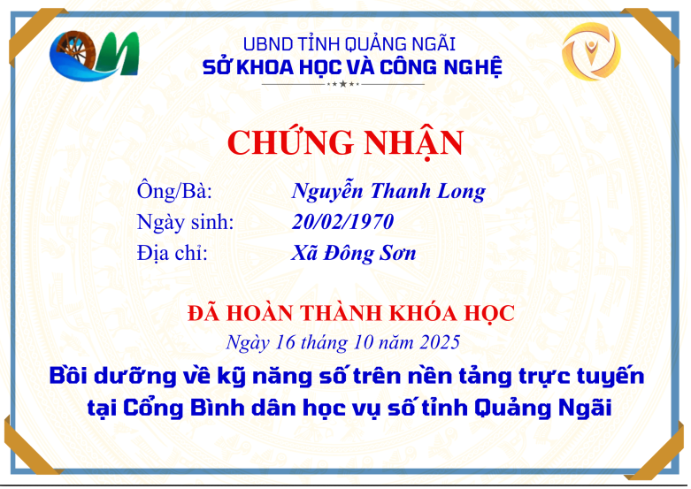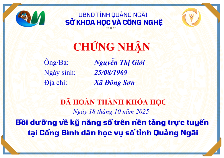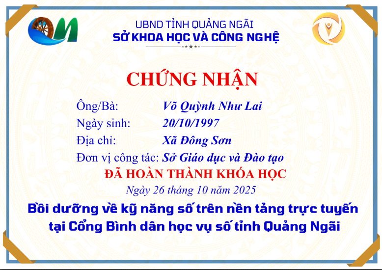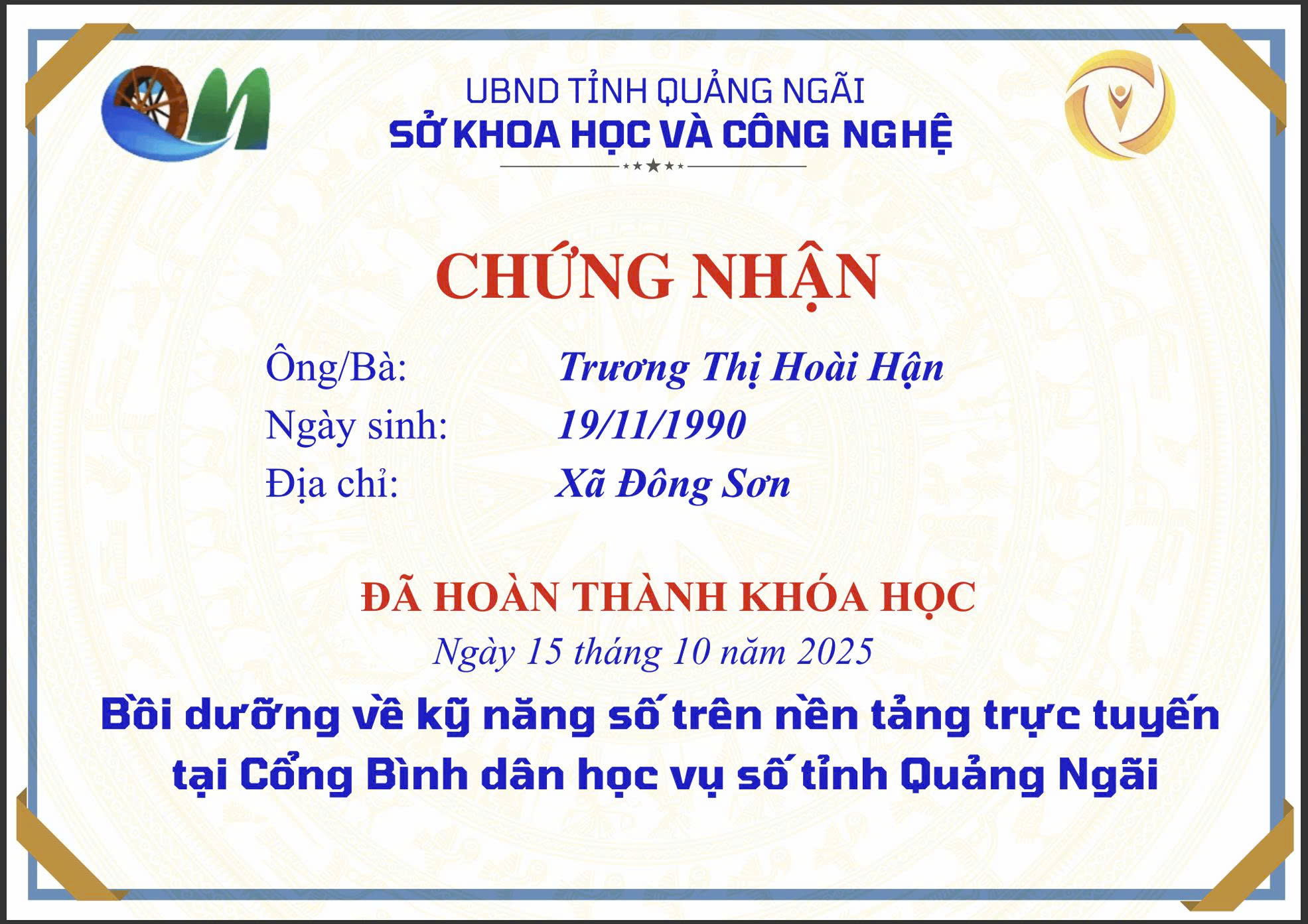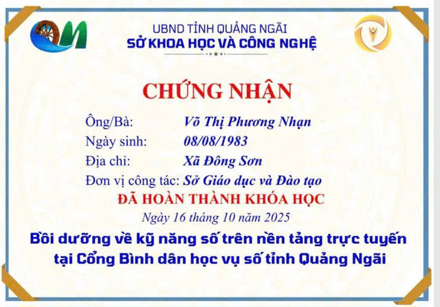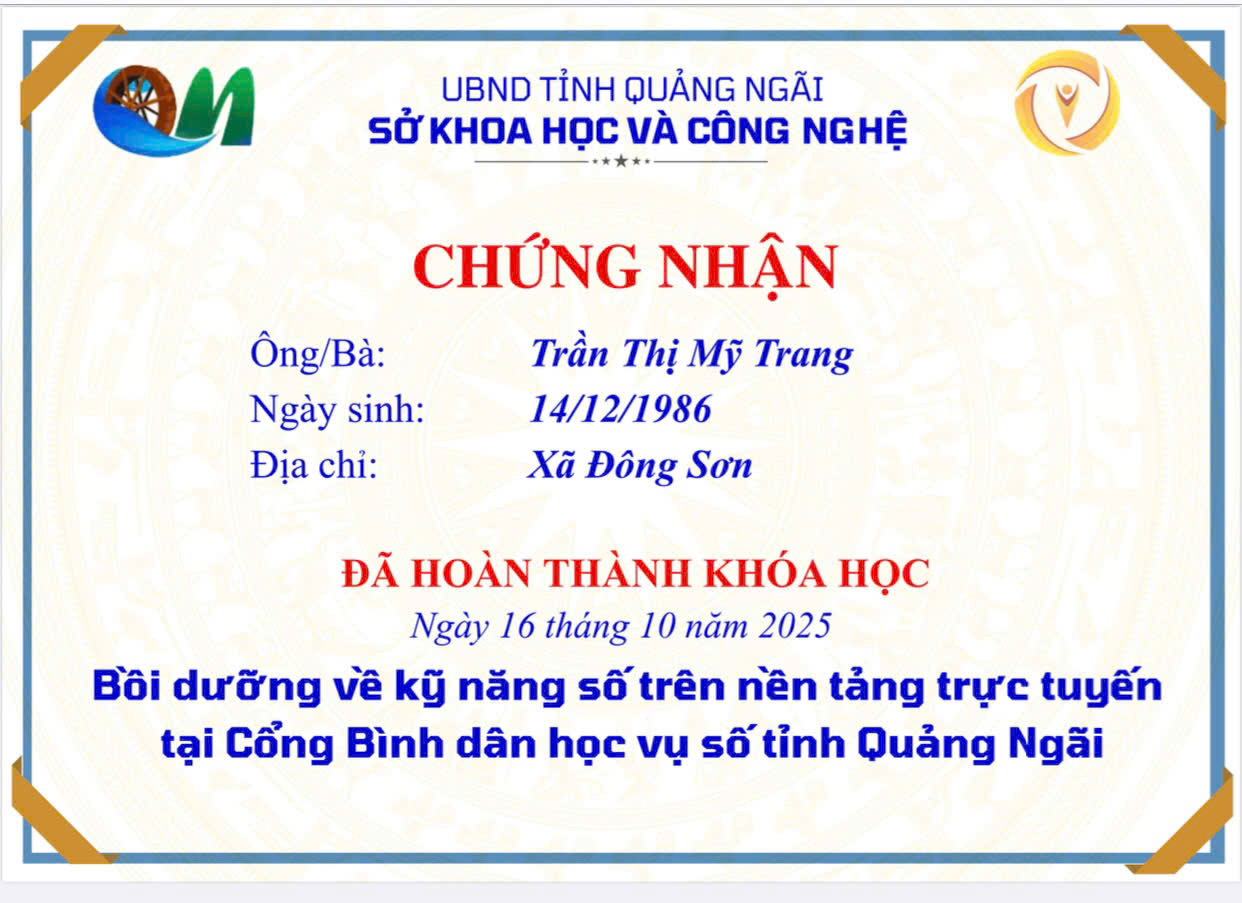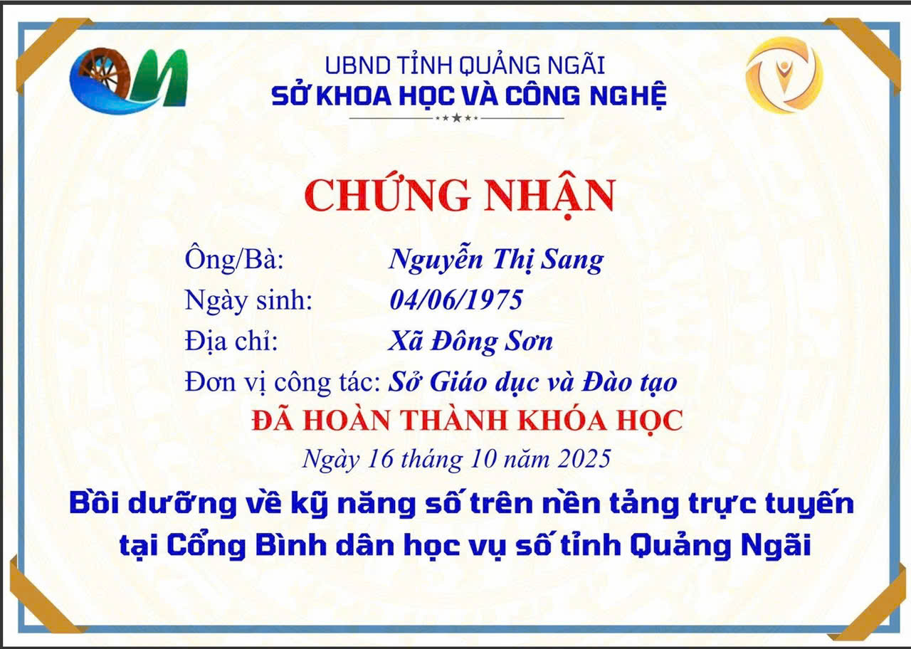 Chứng nhận bồi dưỡng kỹ năng số trên nền tảng “Bình dân học vụ số” tỉnh Quảng Ngãi của trường Tiểu học số 2 Bình Châu